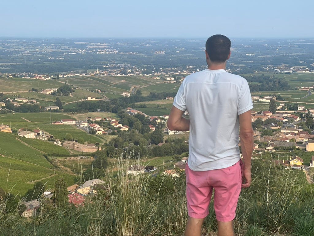 Pictured: Your author standing outside of a hilltop church near Julienas, Beaujolais